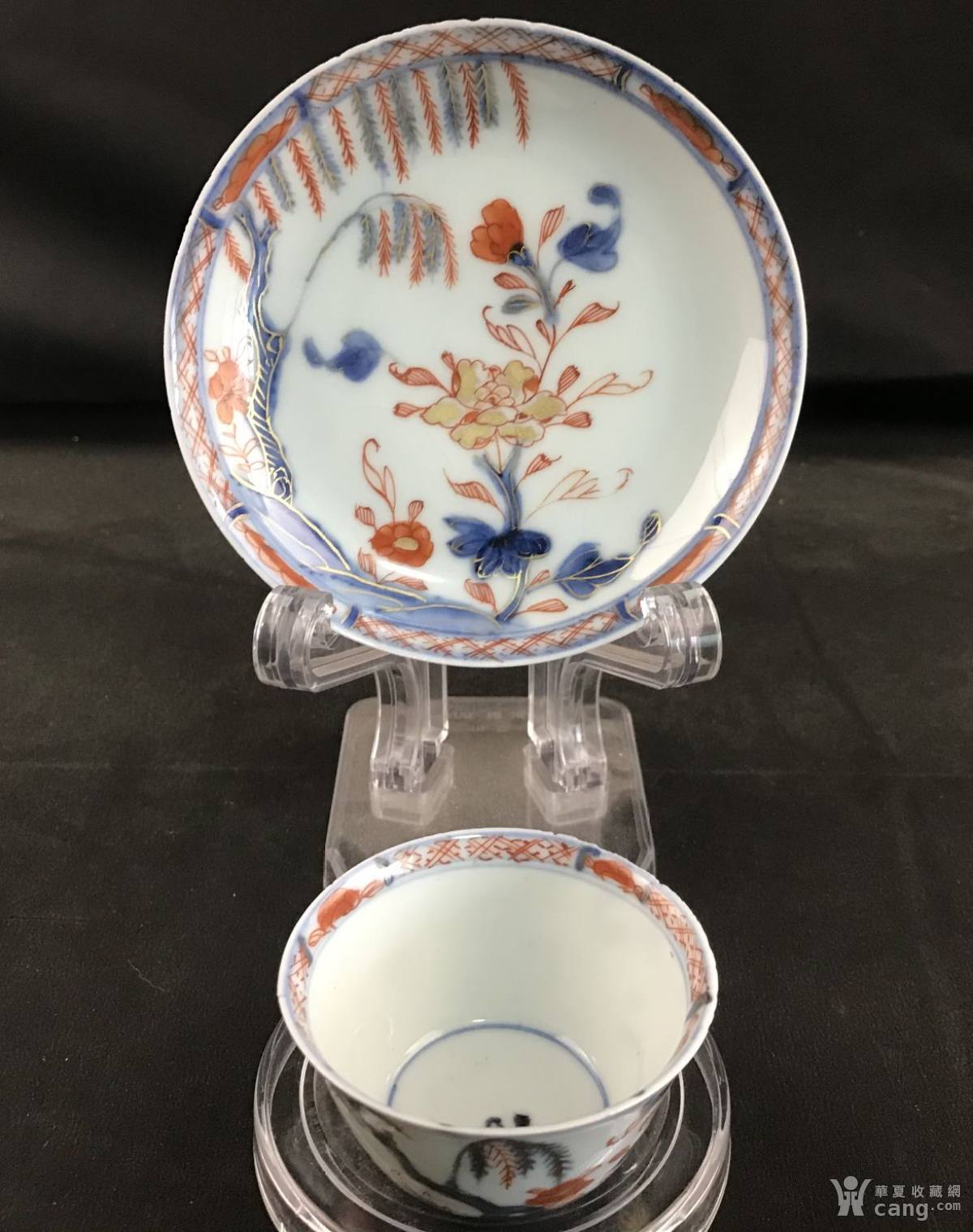 清康熙“杨柳花卉纹”青花加彩杯碟。