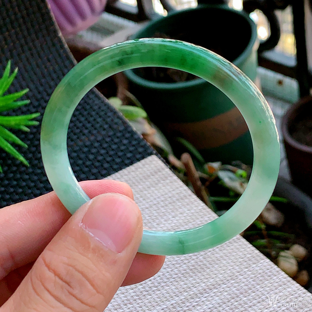 缅甸天然翡翠A货冰透水润飘绿圆条手镯54.8圈口