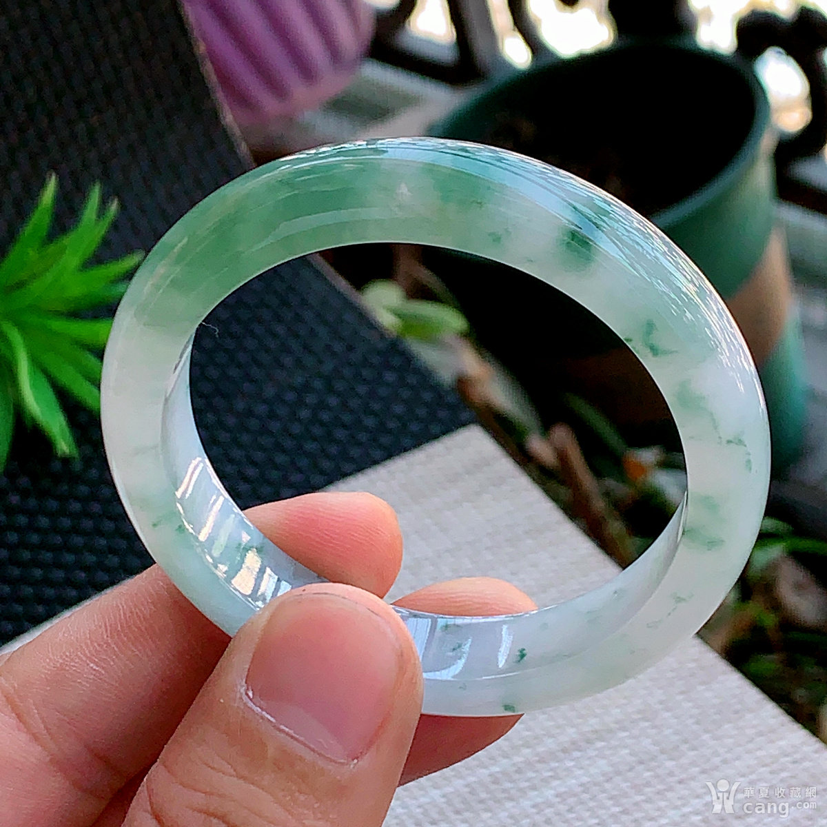 缅甸天然翡翠A货冰透水润飘绿宽边手镯53.8圈口