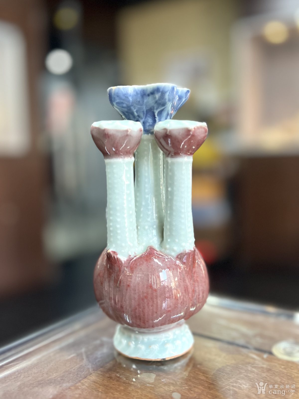 清晚期精品青花釉里红荷瓣形五孔瓶