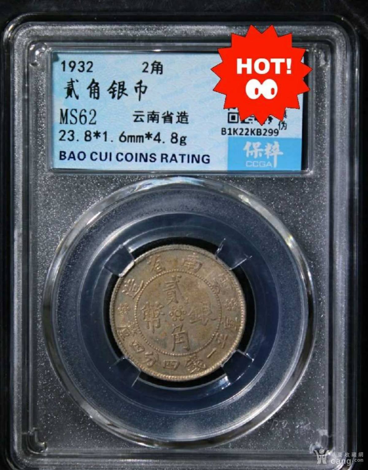 云南造双旗二角银币一枚,保粹评级MS62分,保真包老,按图发