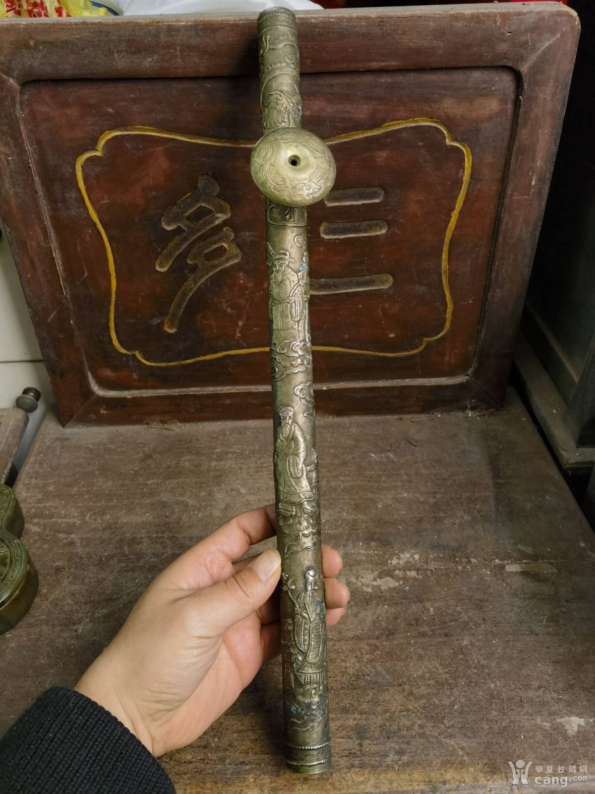 民国刻龙纹福禄寿人物铜鎏银老烟枪,重210克,长67.6,
