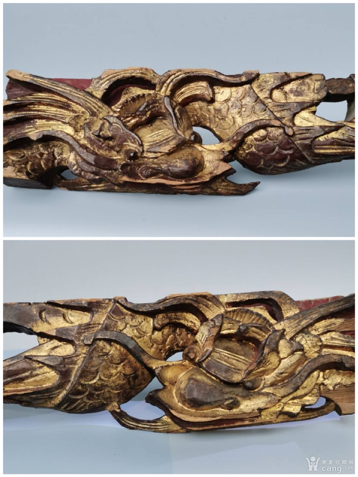 清代金漆木雕雀替,镂空雕鱼化龙一对,床楣下的拱撑装饰花板,