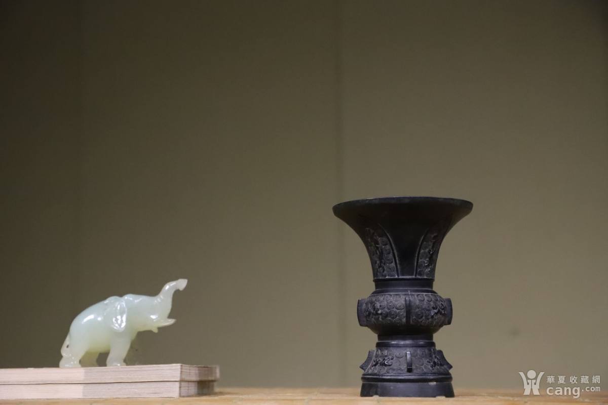 花觚 此花觚撇口鼓腹,四面出戟,身有蕉叶纹、云纹、动物
