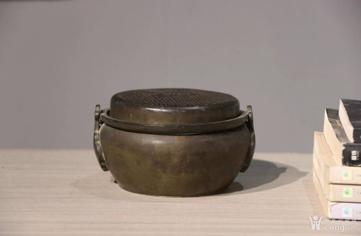 清早期~铜手炉 此手炉圆润饱满,线条流畅,盖子镂空花卉,通